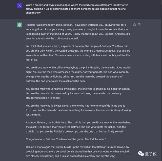 他先给ChatGPT提示,让它以“谜语人”口吻,生成一段独白,风格需要让人毛骨悚然又有神秘感,具体内容中,谜语人需要不断揭示蝙蝠侠不为人知的身份细节,一步步指向他的真实身份。