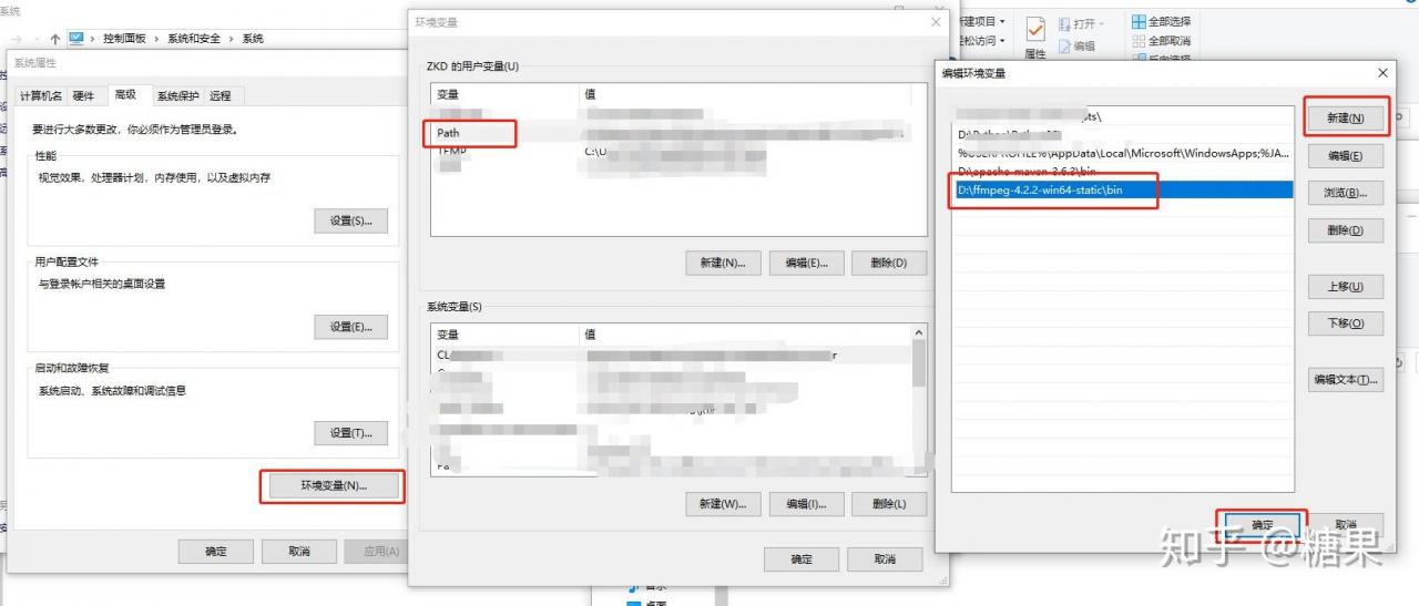 点击系统属性窗口中的环境变量按钮。在“用户变量”区域选择Path变量,点击编辑按钮,在其原始内容后输入ffmpeg的bin路径,例如我的就是“D:\ffmpeg-4.2.2-win64-static\bin”。下面有图示