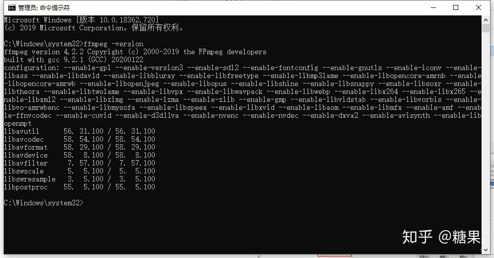 打开命令提示符窗口。输入命令“ffmpeg –version”。如果命令提示窗口返回FFmpeg的版本信息,那么就说明安装成功了。