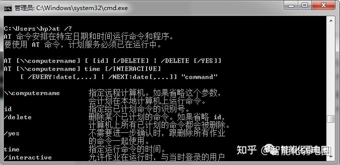 这个命令的作用是安排在特定日期或时间执行某个特定的命令和程序(知道net time的重要了吧?)。当我们知道了远程主机的当前时间,就可以利用此命令让其在以后的某个时间(比如2分钟后)执行某个程序和命令。用法:at time command \computer。