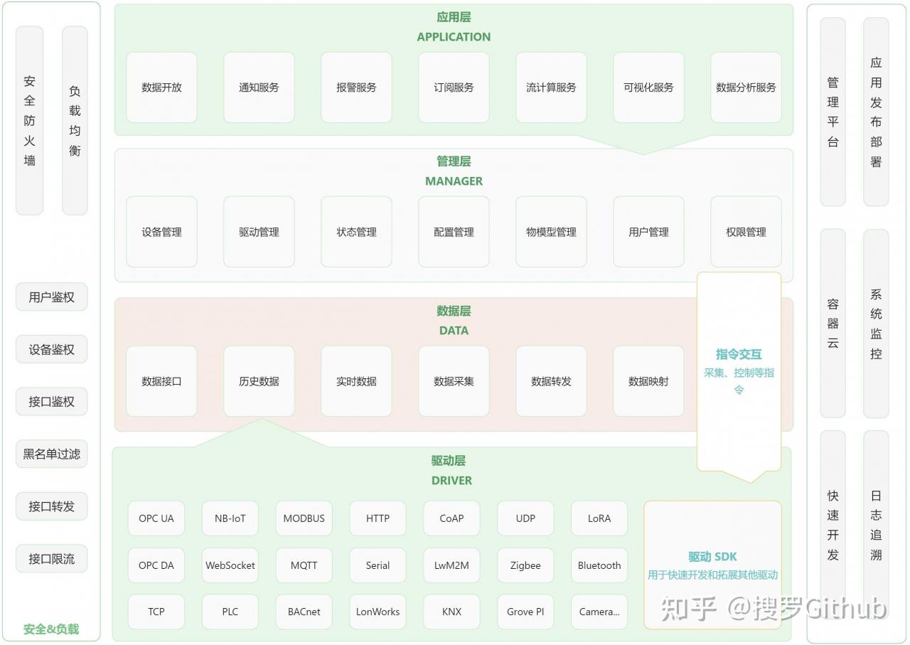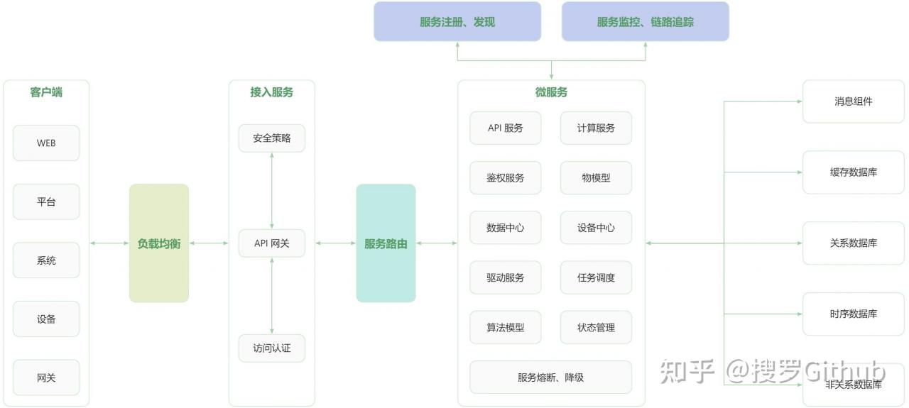 架构开发的,是一系列松耦合、开源的微服务集合。 微服务集合由 4 个微服务层和两个增强的基础系统服务组成,提供从物理域数据采集到信息域数据处理等一系列的服务。