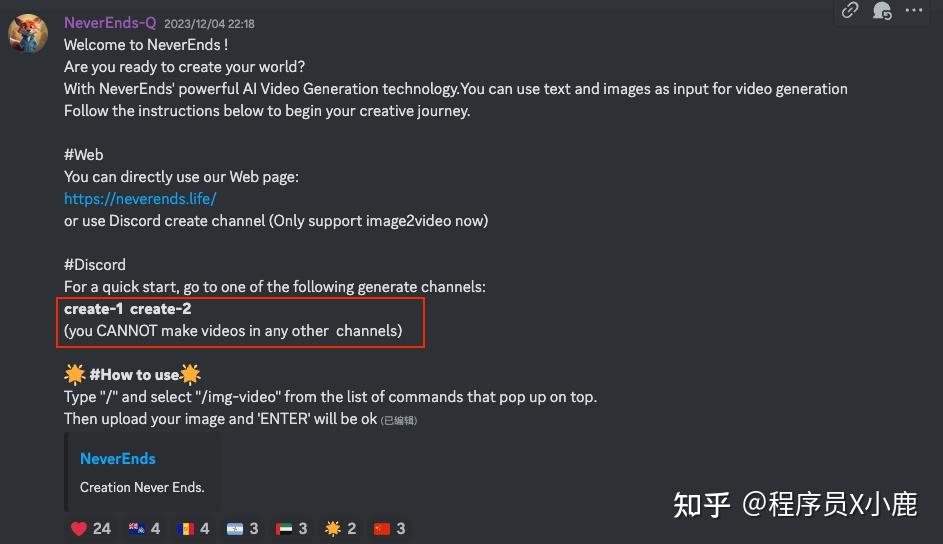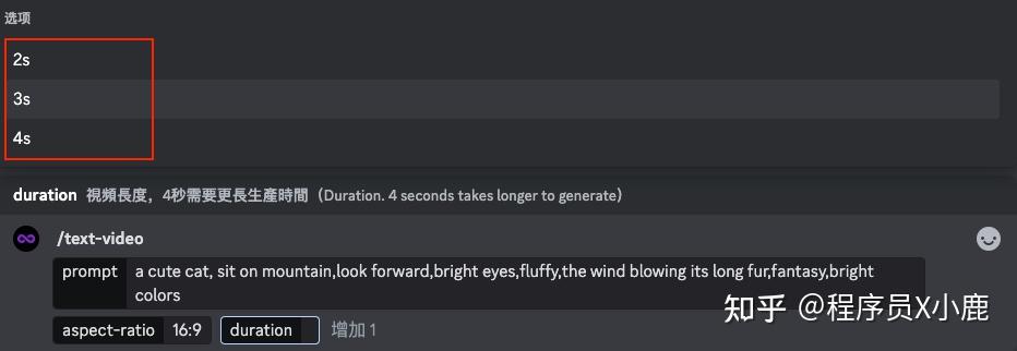 注意红框中的提示,目前只能在 create-1 和 create-2 频道中生成视频,其他频道无法生成视频。所以生成视频的时候记得先切到 create-1 或 create-2 哦。