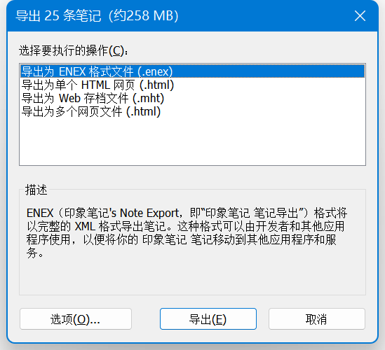 2022 年下半年发布的 7.0 以后的版本已经关闭了通用的 . enex 导出,所以需要从网上找一个 6.22.54.4163 这样的版本。6.0 的数据库和 7.0 之后的版本是完全兼容的,直接卸载新版,安装旧版就可以。