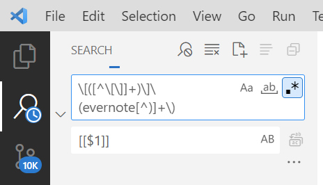 Visual Studio Code – Code Editing. Redefined 可以从官方网站下载,这是我能够想到的图形化的文本文件批量替换的工具,能够和 Obsidian 很好的配合工作,当然其他的 regex 工具应该也可以。