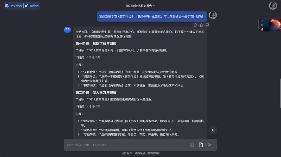 3)个人助理和知识管家 你有任何问题都可以向它提问,比如我的提问“我想系统学习《黄帝内经》,你可以给我出一个详细的学习计划吗”