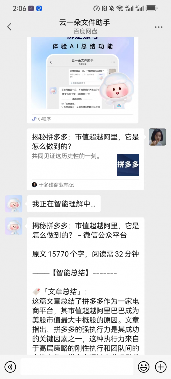百度云一朵,它是百度网盘基于文心大模型推出的 AI 助理,只要将文章发送给它,它就能快速提炼出核心内容,还能分段总结关键要点。