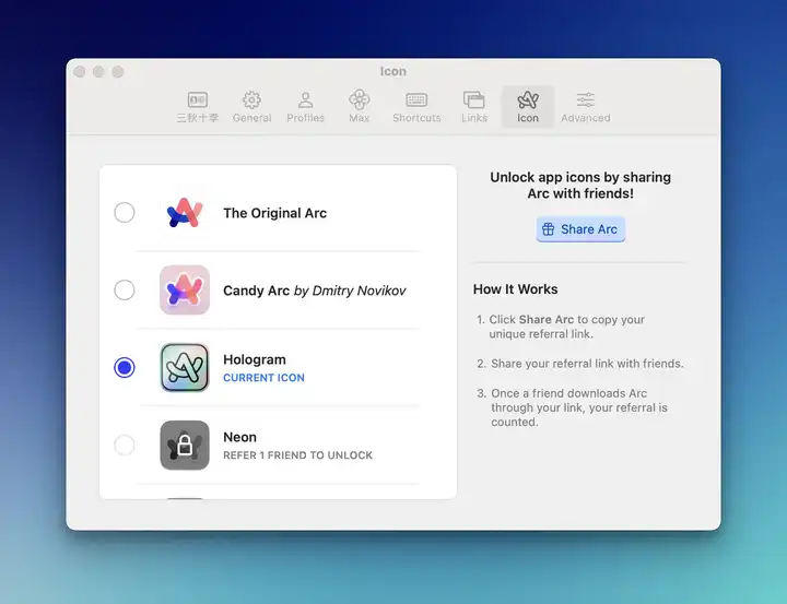 网友分享了一个方法可以直接使用锁的图标而避开邀请要求,终端里执行 “defaults write company.thebrowser.Browser currentAppIconName -string flutedGlass”,参数 -string 后面的是 icon 名的小驼峰格式。除了这个方法外,可以去这个网站直接查找网友上传的 Arc 图标,找到喜欢的就复制下来直接在 Arc 的详细信息里粘贴替换就好