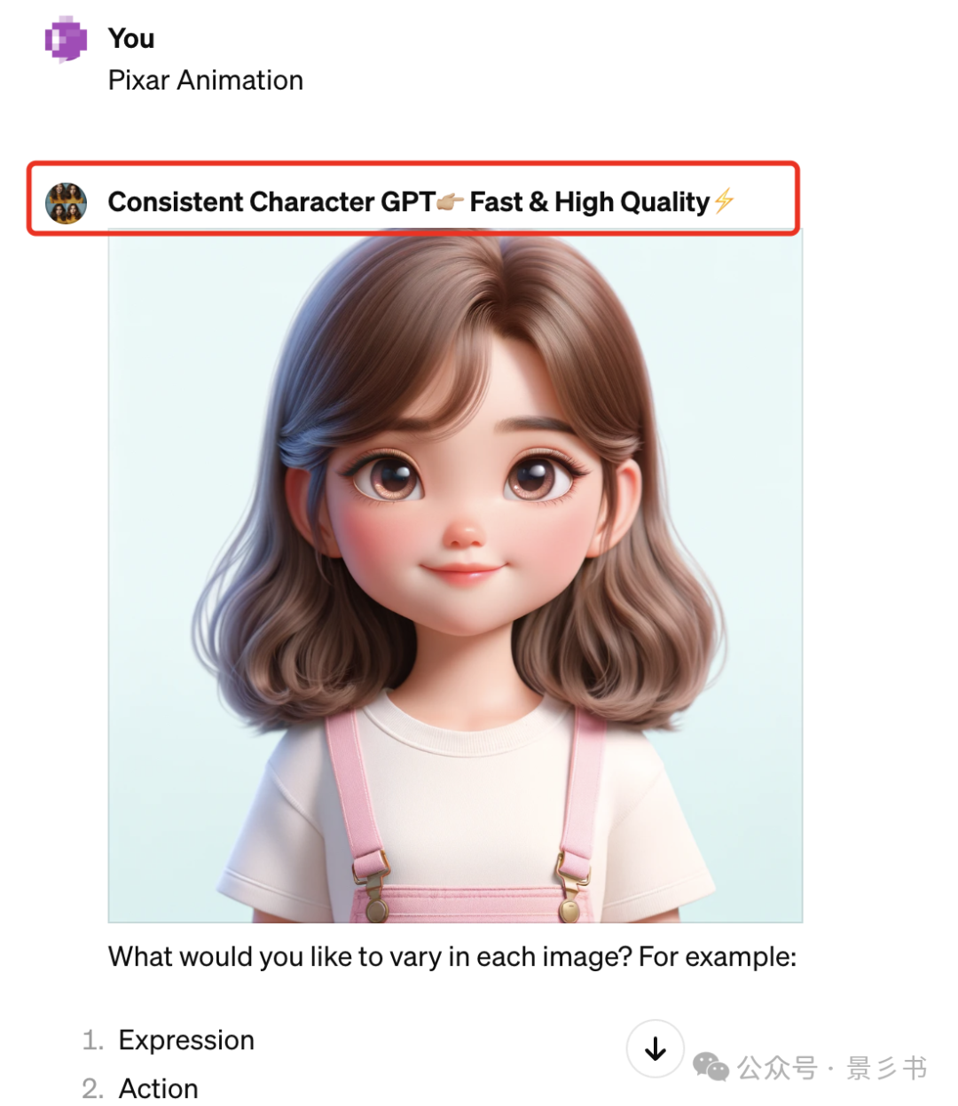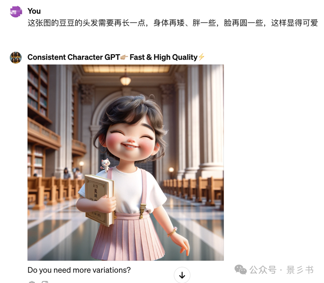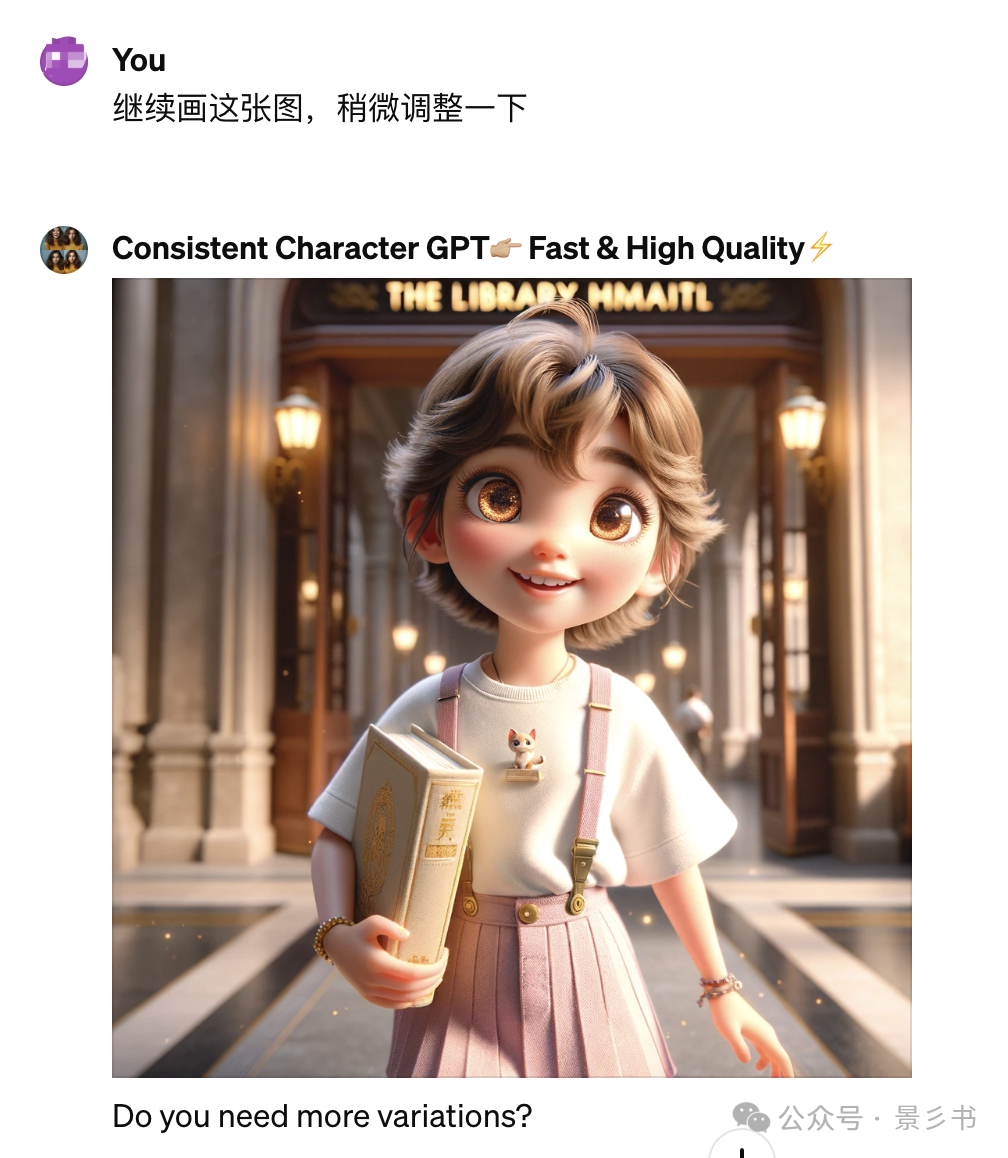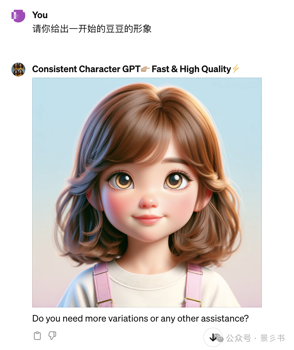 然后我直接用了一个GPTs(Consistent Character GPT-Fast & High Quality),效果还行。如果我对人物的描述再具体一点,效果应该会更好。