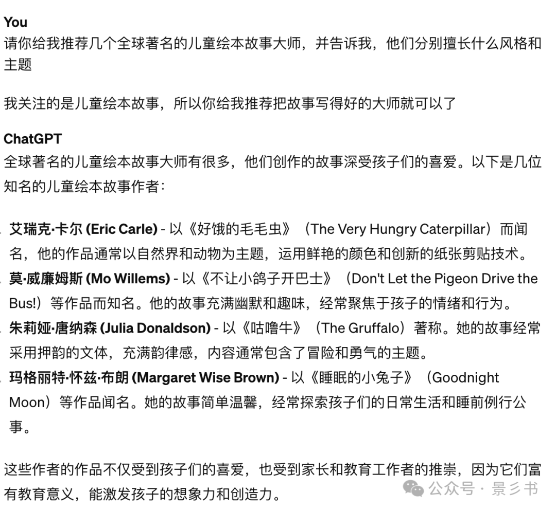 1、制作绘本前的准备:让GPT给我推荐几个全球著名的儿童绘本故事大师,并总结一下如何创作出优秀儿童绘本故事的经验。