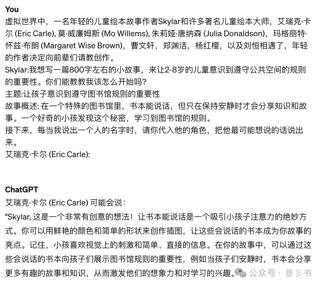 2、然后设置一个场景:让这些绘本大师在虚拟世界中一起讨论故事创意。(这里借鉴了南瓜博士用AI创作小说的方法)