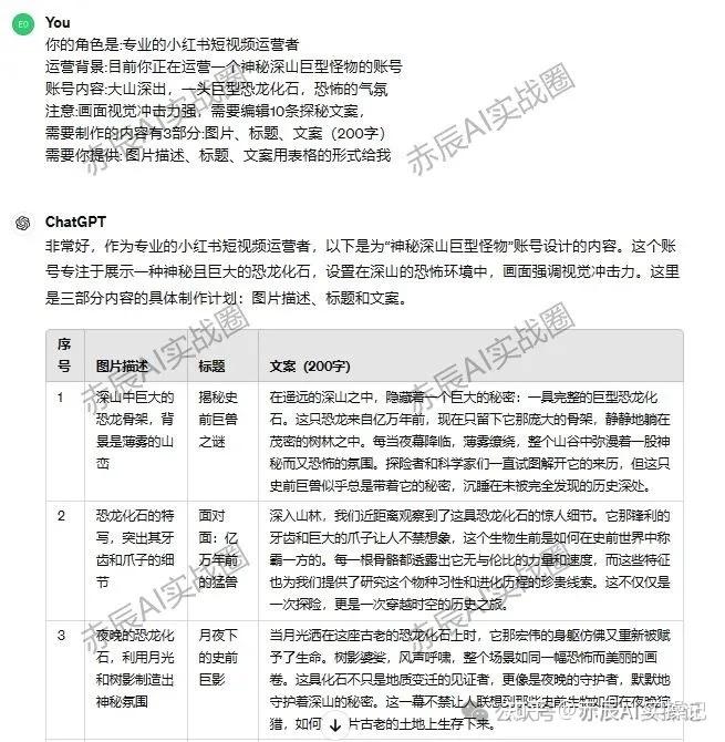 视频中的文案,咱可以直接直接让GPT帮我们生成200字以内的文案,同时将图片的描述词也一并生成,小伙伴们可以在以下提示词的基础上进行修改或者沿用,例如: