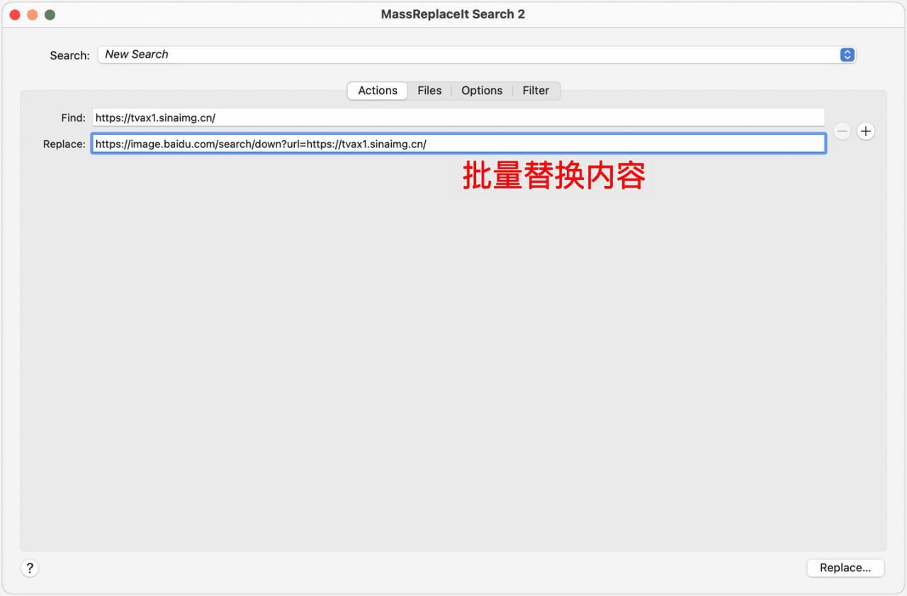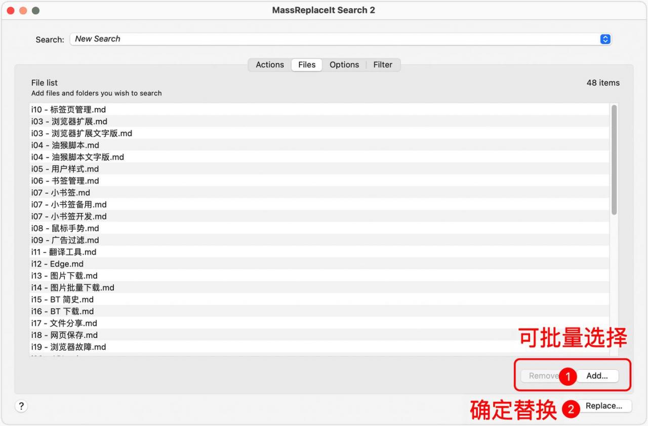 Mac 平台的话,由于 MassRepalceIt 没有中文版,这里简单说一下操作方法。