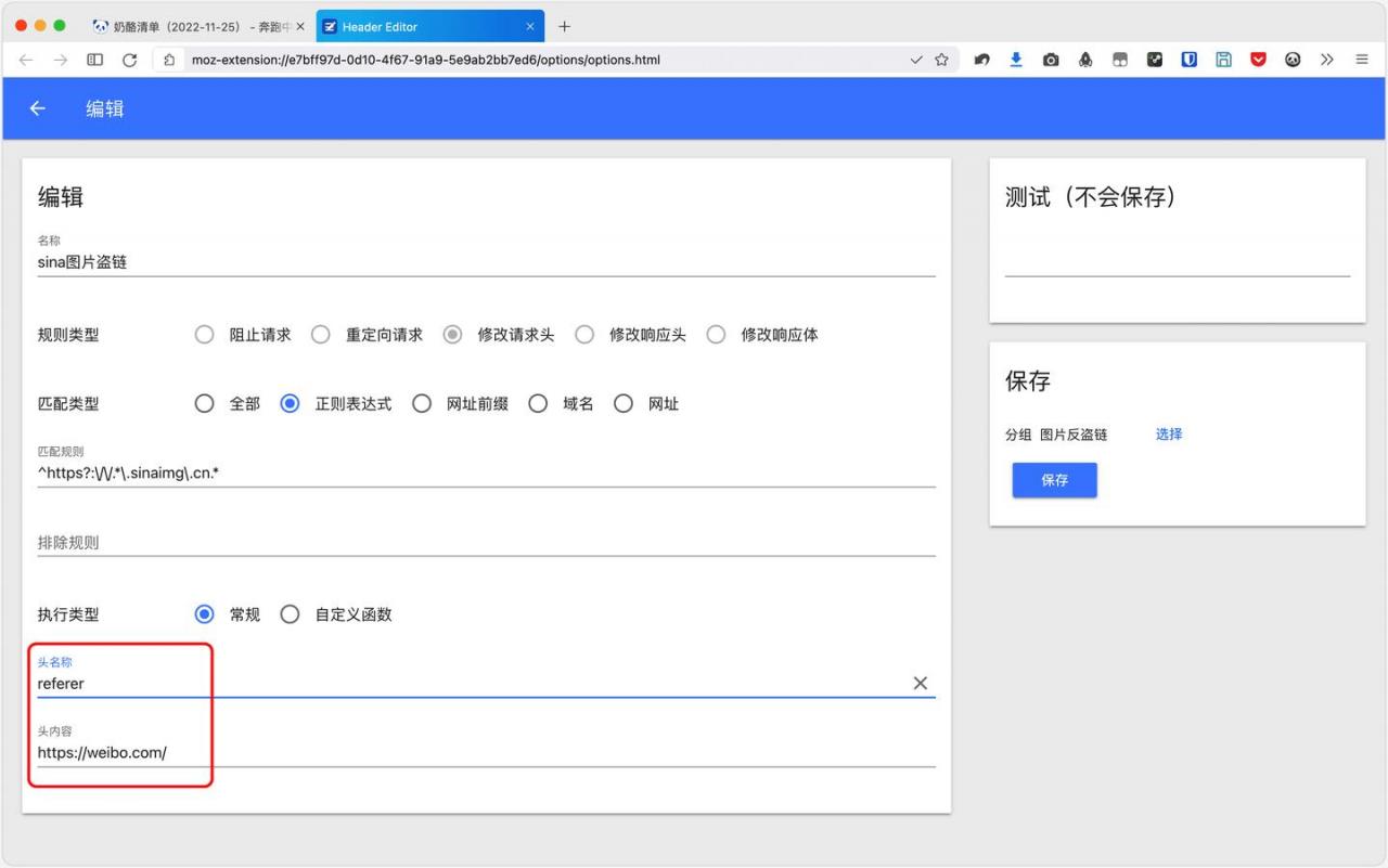 具体方法是使用扩展 Header Editor,然后,将图片的 Referer 设置为微博域名 https://weibo.com/ 即可。