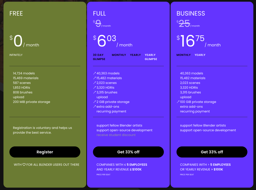 目前官网有三种方案,免费版也可以拥有14724个模型、15469个材质、1853个HDRI贴图,非常够用了。