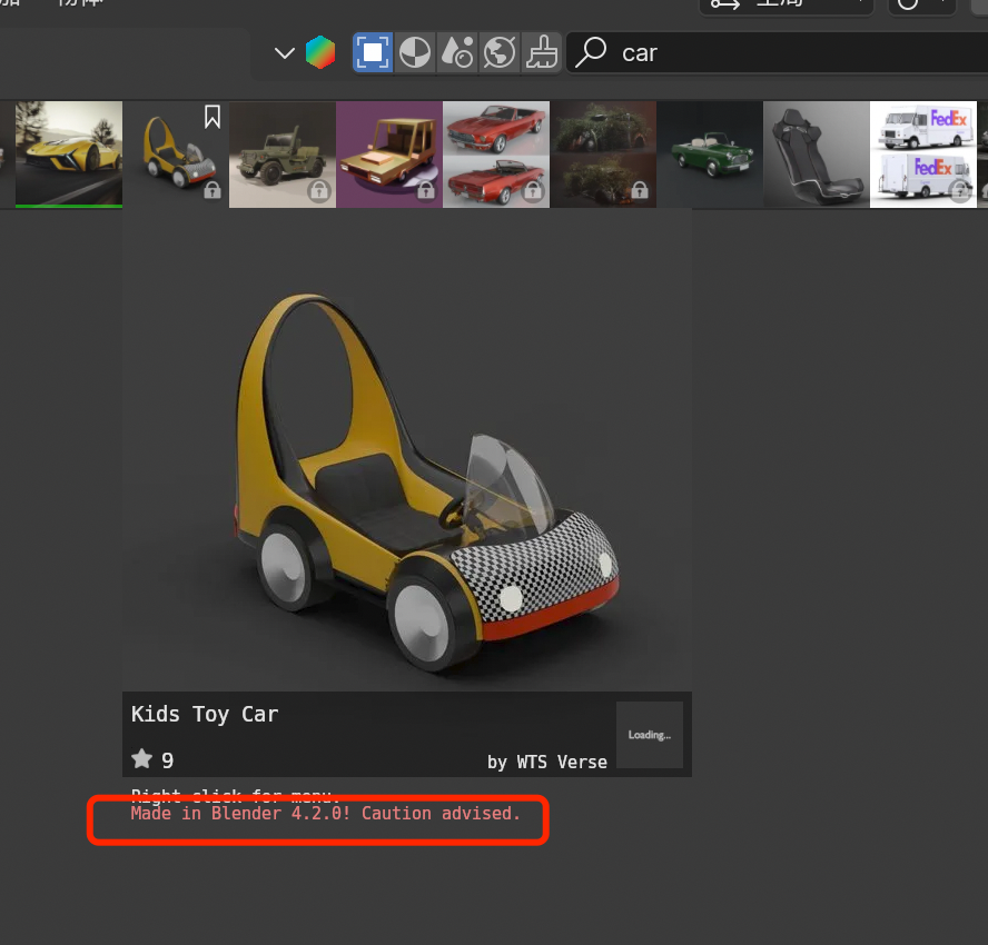 有些模型会有一些提示,告诉你该素材的版本是高版本Blender创建的,可能会有一些问题。