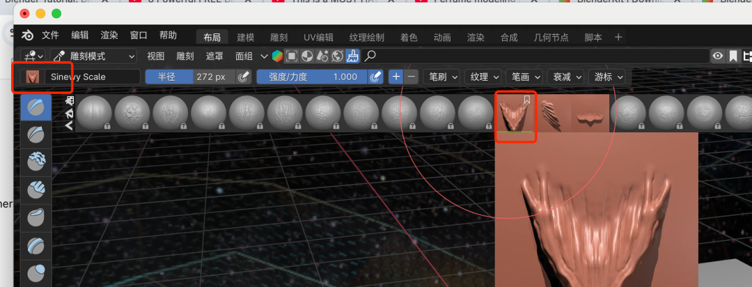 当我在雕刻模式下点击某个笔刷,我们的笔刷就自动切换为该笔刷。