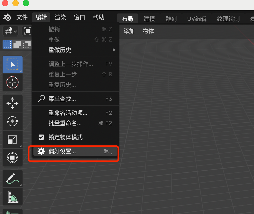 打开blender,在顶部菜单点击【编辑】-【偏好设置】。