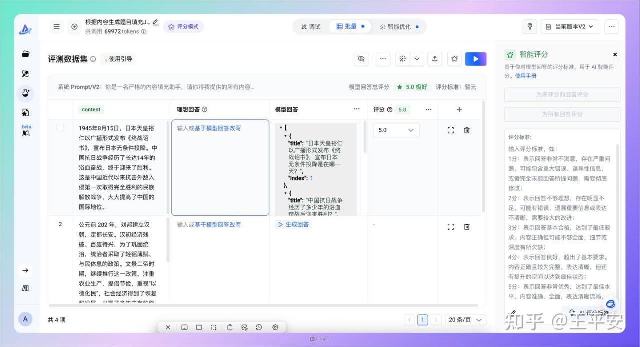 - 批量完成评分:支持“用户打分”和“AI 智能评分”。使用“AI 智能评分”时,需要先明确评分标准,可以选择“用户输入评分标准”或“AI 生成评分标准”。