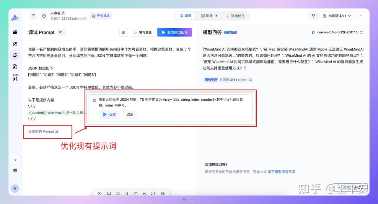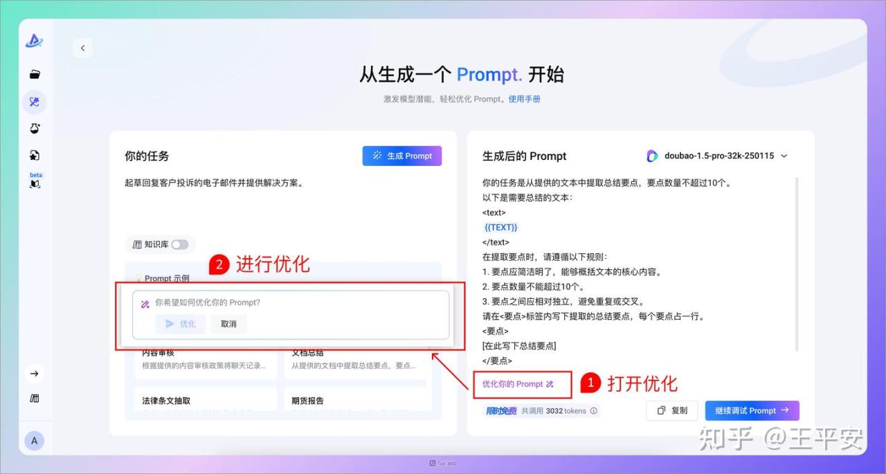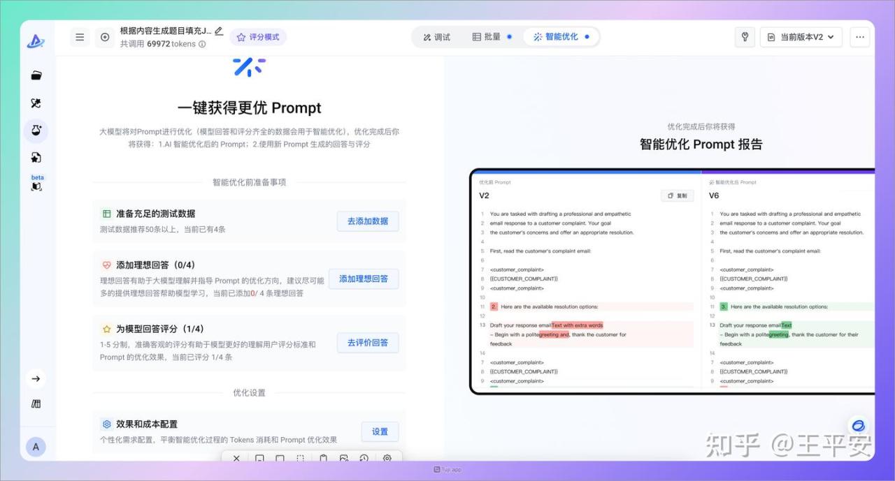 然后就可以按照现在返回的结果,进行提示词优化,打开左下角“优化你的 Prompt”按钮,输入需要优化的方式即可: