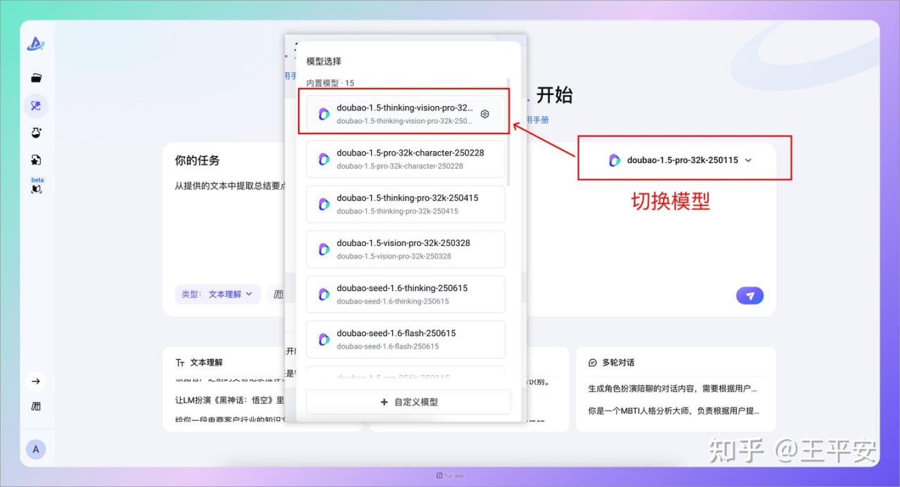 - 切换模型:如果觉得默认模型生成的提示词效果不好,还可以切换不同模型,支持豆包、DeepSeek 和自定义模型,很方便。