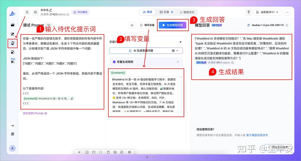 PromptPilot 另一个核心功能是提示词优化,使用时可以按照下面步骤先调试一下提示词: