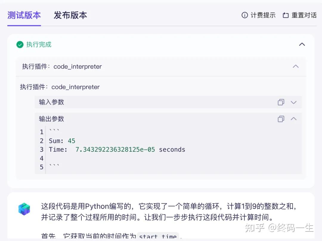 可以看到智能体因为引入了「Python 代码解释器」插件,直接运行我们的Python代码,并将运行结果结合大模型分析一起返回给我们,具体如下: