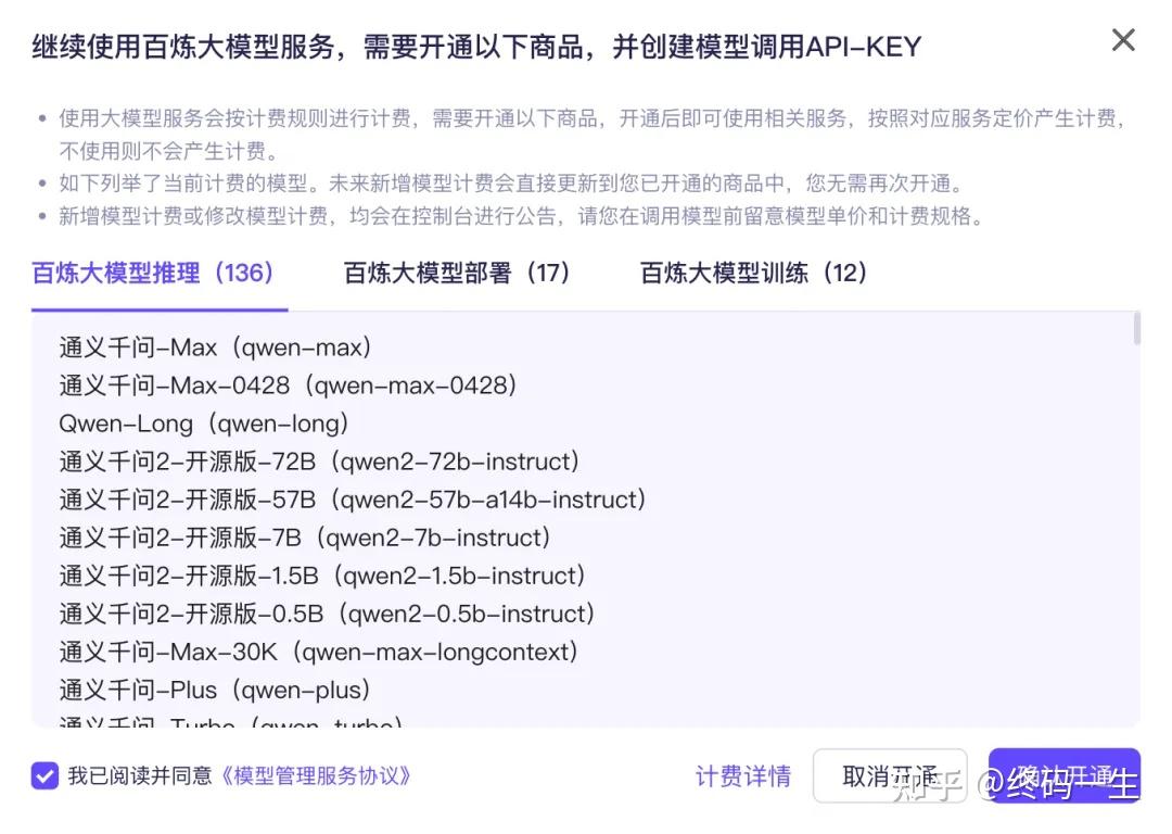 模型是智能体的“大脑”,我们必须选择。首次使用,我们需要开通模型调用,部分模型是限时免费的,也有付费的模型,这个根据自己的情况选择,具体收费大家可以看官方token计费说明。