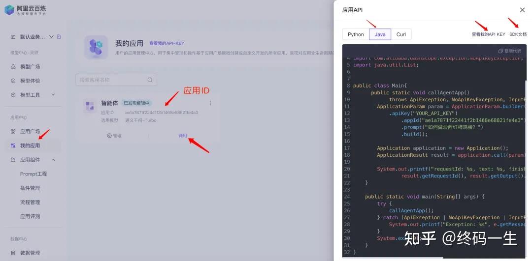 我们返回到首页,选择「我的应用」,可以看到刚才创建的智能体,点击「调用」,这里用Java调用,首先,创建APIkey,同时需要我们导入SDK。