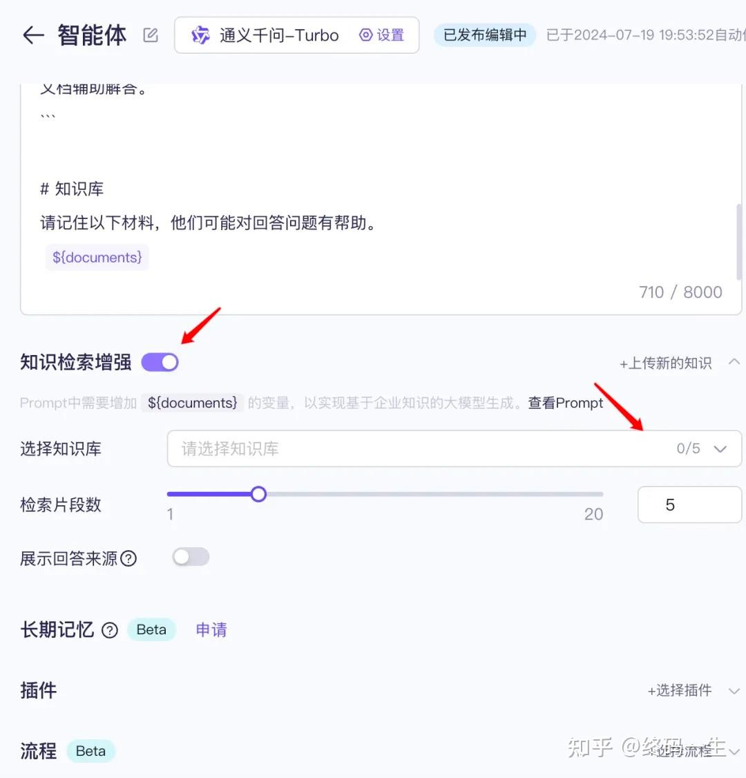 上传操作很简单,配置基本都是默认。上传完,我们返回到刚刚创建的智能体,并选择「知识检索增强」,选择我们刚上传的知识库,其他配置不变。