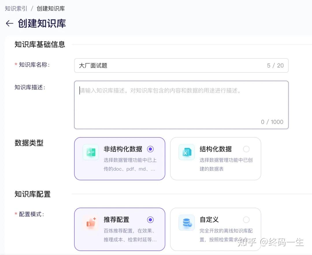 我们点击「数据中心」-「数据应用」-「知识索引」-「添加知识库」,将文档资料拖拽上传即可。下面我上传一套大厂面试题。