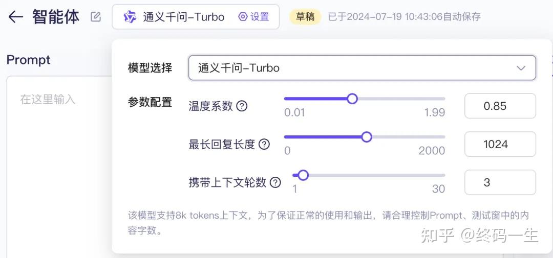到这里其实我们已经创建了一个简单的智能体应用,一个基于通义千问-Turbo模型的智能体。我们可以选择发布,发布之后就可以通过API调用刚发布的应用,并嵌入到我们业务中使用了,下面我们先测试下。这里要说下Prompt:
