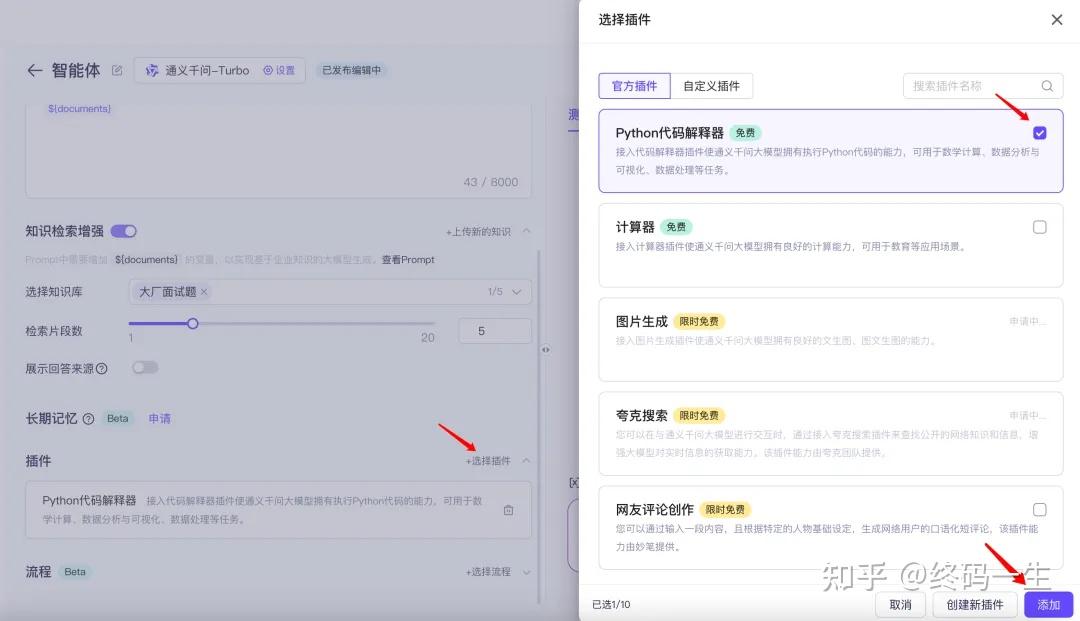 在日常开发中,我们常常会遇到存在一些特殊需要的场景,比如有时候可能对数据实时性的要求比较高,这个时候我们就可以引入插件,增加大模型的交互性,或者我们有一些数学计算类的业务场景等。这里百炼给我们准备的有几款预置插件「Python代码解释器」「夸克搜索」、「计算器」、「文生图」,在创建智能体应用的时候,我们可以将其加入。