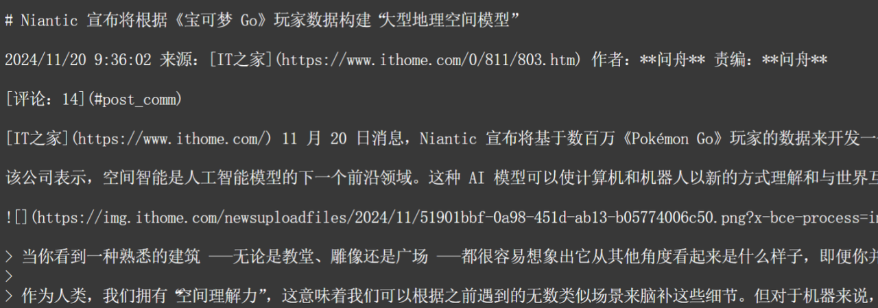 下面,以抓取一个 html 页面,并输出为 markdown 格式,给大家展现下效果。