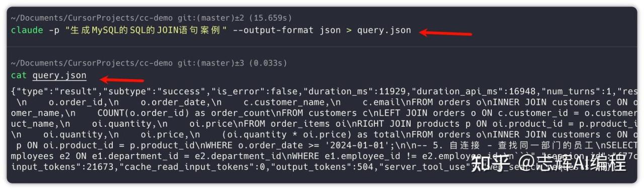 claude -p "生成MySQL的SQL的JOIN语句案例" --output-format json > query.json