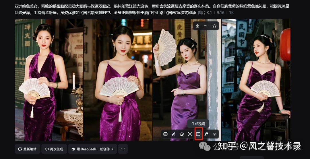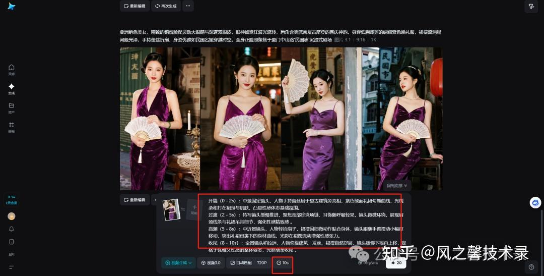 视频模型选择即梦3.0,提示词:开篇(0 – 2s):中景固定镜头,人物手持蕾丝扇于复古建筑旁亮相,紫色缎面礼裙勾勒曲线,光线柔和打在裙身与肌肤,凸显性感体态基础氛围。