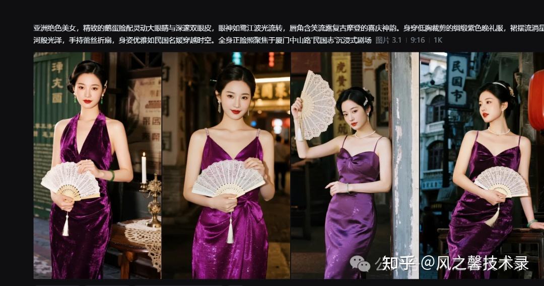输入提示词:亚洲绝色美女,精致的鹅蛋脸配灵动大眼睛与深邃双眼皮,眼神如鹭江波光流转,唇角含笑流露复古摩登的喜庆神韵。身穿低胸裁剪的绸缎紫色晚礼服,裙摆流淌星河般光泽,手持蕾丝折扇,身姿优雅如民国名媛穿越时空。全身正脸照聚焦于厦门中山路’民国志’沉浸式剧场