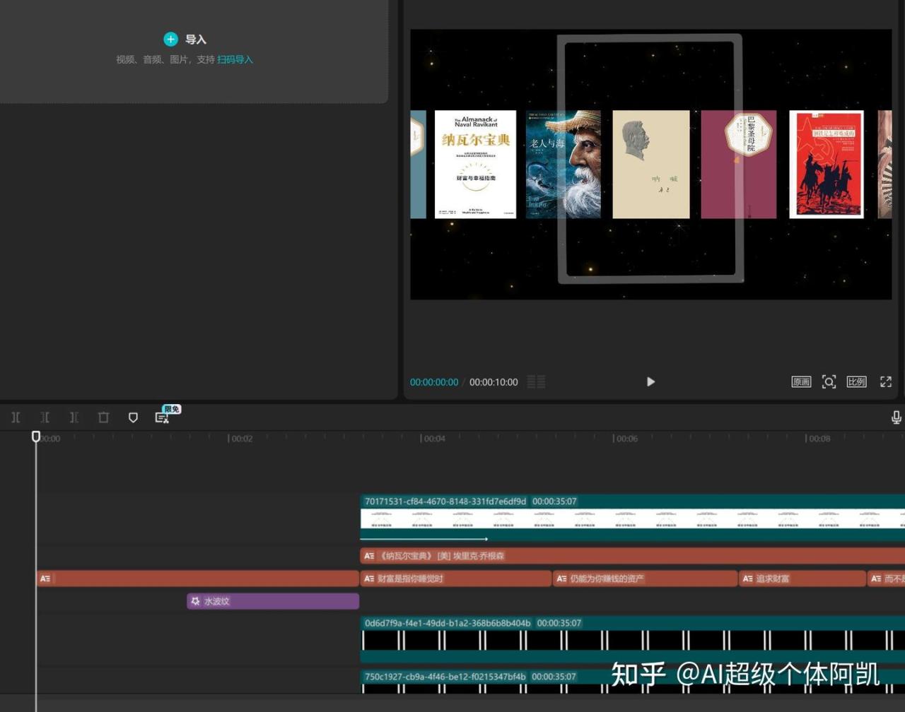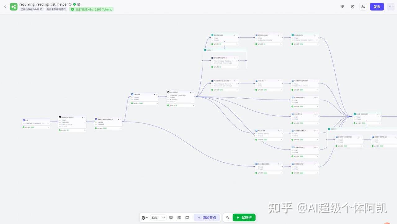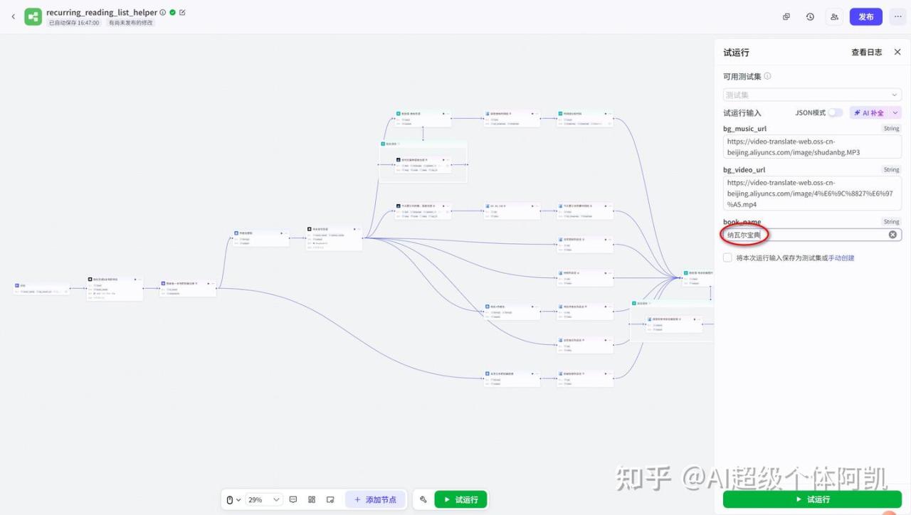 该工作流的搭建比较简单,先通过豆瓣插件搜索书籍信息,接着使用大模型节点生成文案,再来生成语音、特效等信息,最后使用剪映小助手插件生成视频。