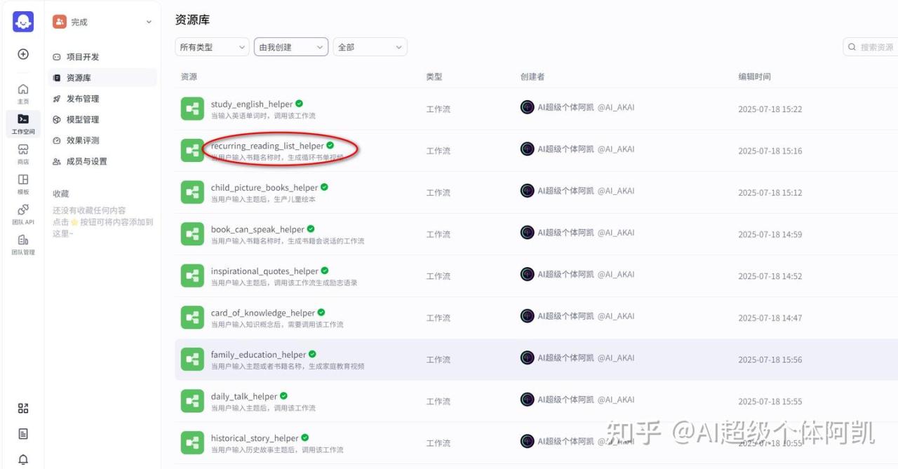登录扣子(Coze),点击【工作空间】,点击【资源库】,找到【循环书单】工作流,点击该工作流。在工作流编辑页面,输入书籍名称,点击【试运行】。