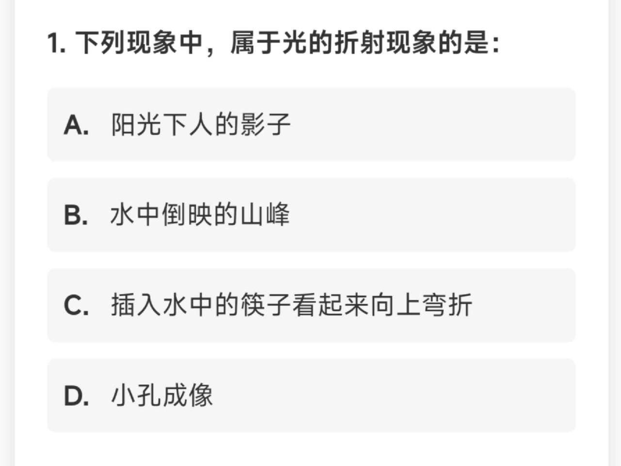 比如下面这个例子,哪个现象属于光的折射: