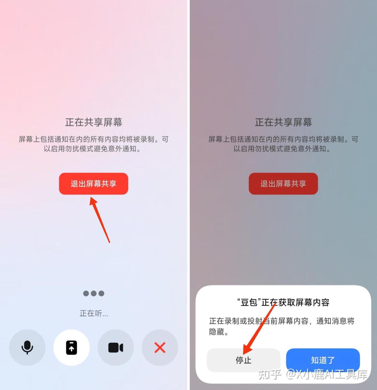 屏幕上方显示「共享中」,如下面的左图,说明豆包已经能看到你的屏幕了。你可以打开其他的 APP 或画面,和豆包交流了。