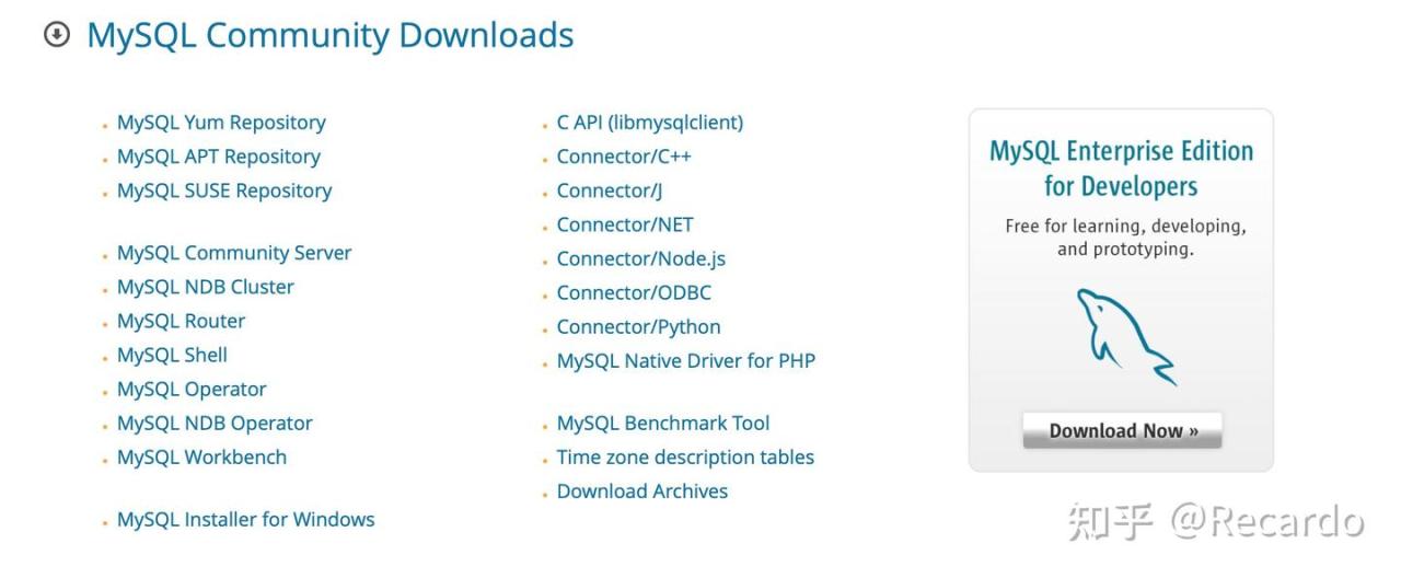 windows系统选择左侧下方最后一个,mac系统选择MySQL Community Server,进入后选择匹配芯片的版本下载,下载MySQL后下载左侧下方倒数第二个的MySQL Workbench作为可视化操作页面。