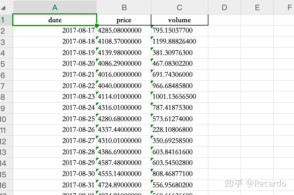 我们先使用以下代码爬取比特币的所有我们需要的数据进行研究,包括“日期”,“价格”,“成交量”,并形成EXCEL保存在本地。我们采用币安的API来进行数据获取。