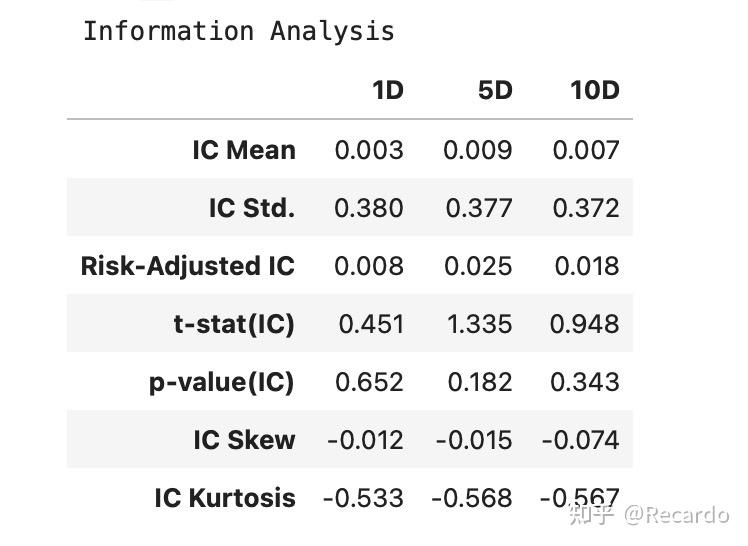 - Risk-Adjusted IC:IC Mean 除以 IC Std.,也就是“IC 的信息比率”,表示单位波动下的预测能力。