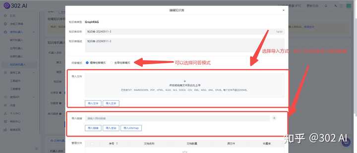 知识库的原理就是 AI 先查询再回答。那么如何查询到关联性高的片段,就是知识库最核心的部分。302.AI 平台的知识库机器人工具就支持 传统 RAG 和 GraphRAG 这2 种模式知识库的一键部署,可以根据自己的需求进行选择。