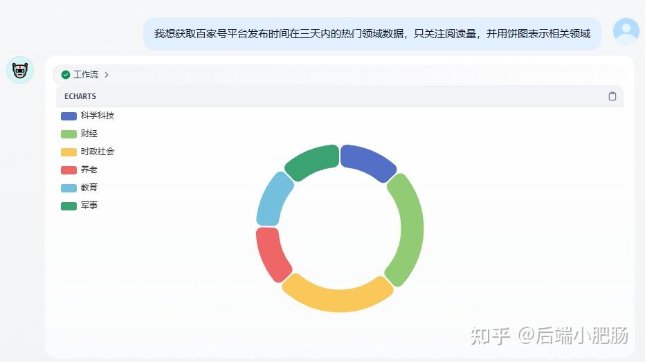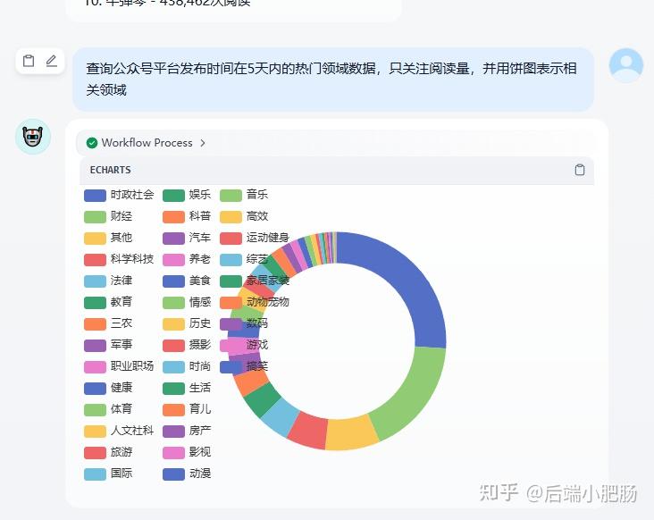 本文将带你了解一套基于Dify+Spring Boot构建的热点分析工具,能在几秒内整合公众号、百家号、今日头条近 7 天的热点数据,用图表直观呈现热门领域分布,用文字解析趋势背后的逻辑,甚至帮你快速定位同领域的头部作者。下图为分析公众号5天内的最热门领域:
