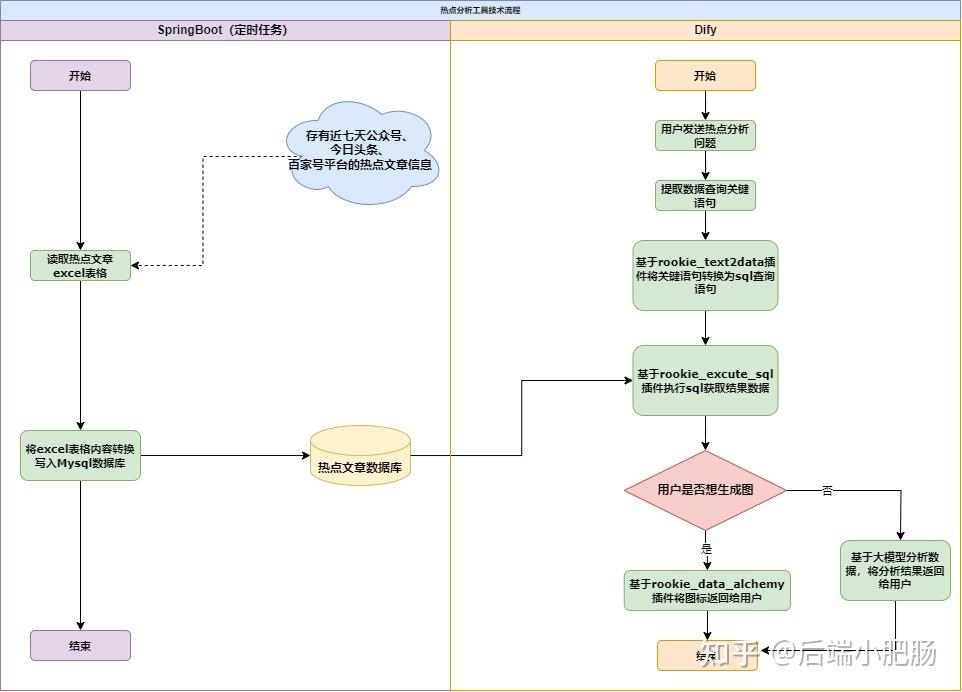 在上图中流程被区分为了SpringBoot定时任务和Dify部分,SingBoot主要负责热点数据的读取并写入Mysql数据库,Dify的流程分为以下几步:
