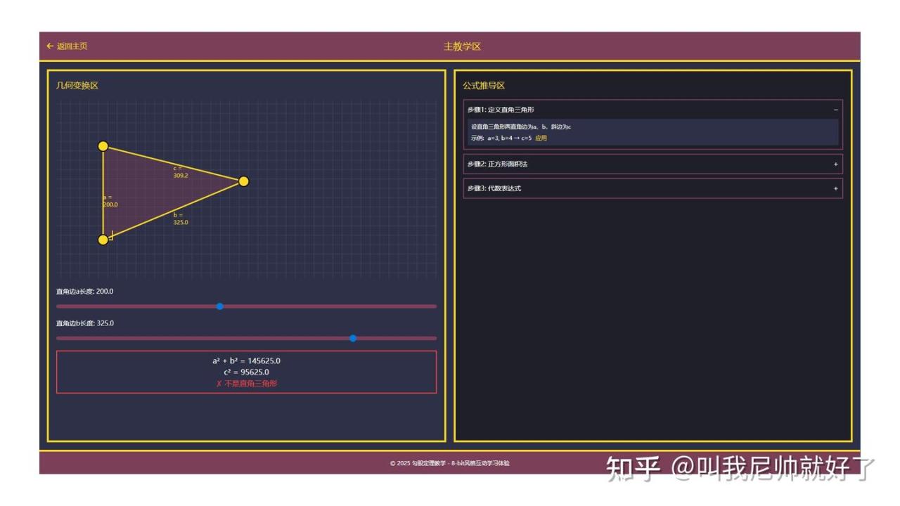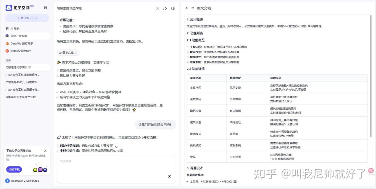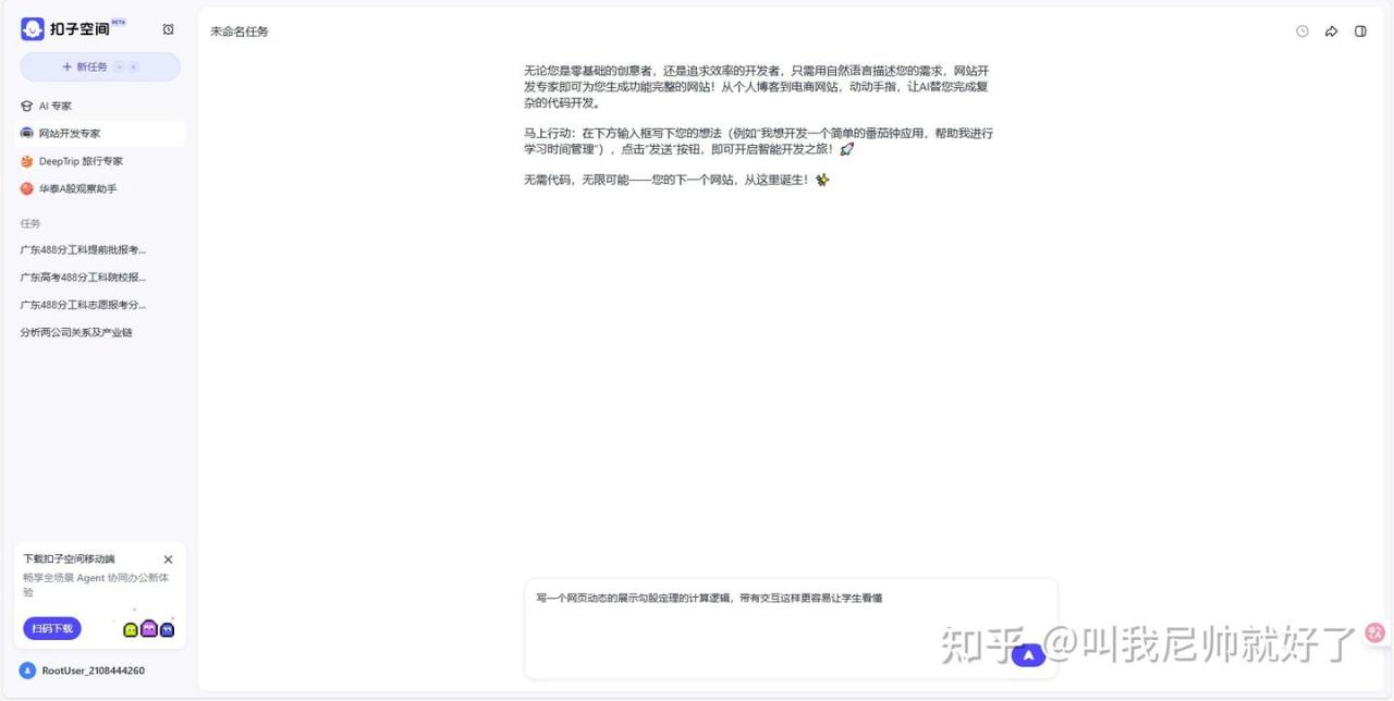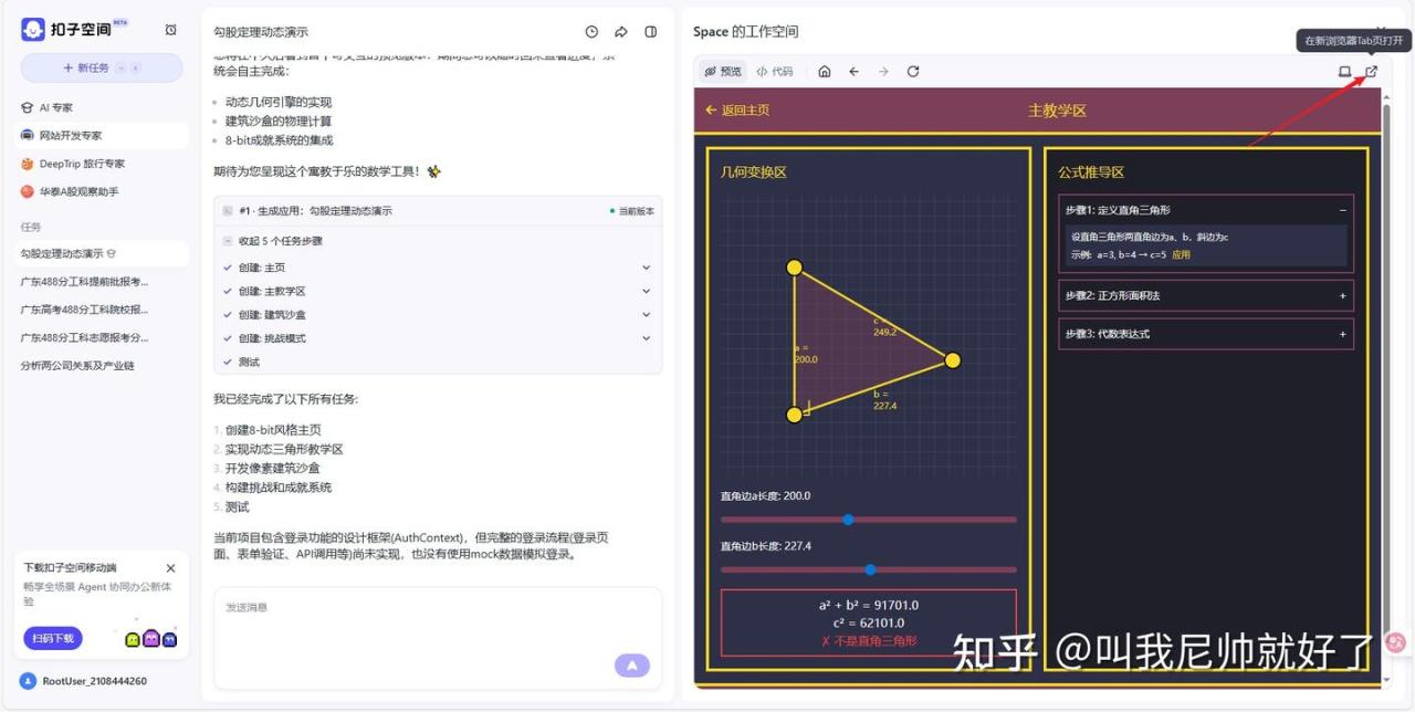 这里以扣子空间为例:让扣子写一个网页写一个动态的展示勾股定理的计算逻辑,带有交互这样更容易让学生看懂