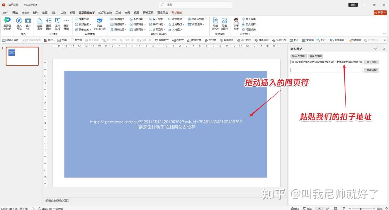 打开需要编辑的 PPT,找到要插入网页的幻灯片。点击插件按钮,在弹出的侧边栏里有个 “网页地址” 输入框,把扣子社区的具体页面链接或者 DeepSeek 的网址复制进去,点 “插入” 按钮。