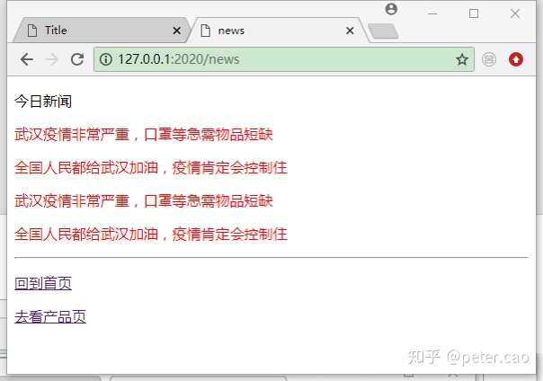然后在news.html页面中使用jinjia2模板中的语法来读取两条新闻内容: