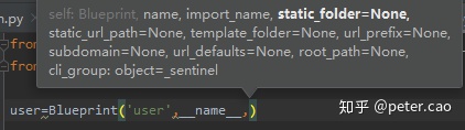 将user.py文件名user作为蓝图来使用传入Blueprint方法中,另外如果需要还可以在这里加入url前缀限定:url_prefix=‘/user’。整个参数包括有很多,这里截图如下: